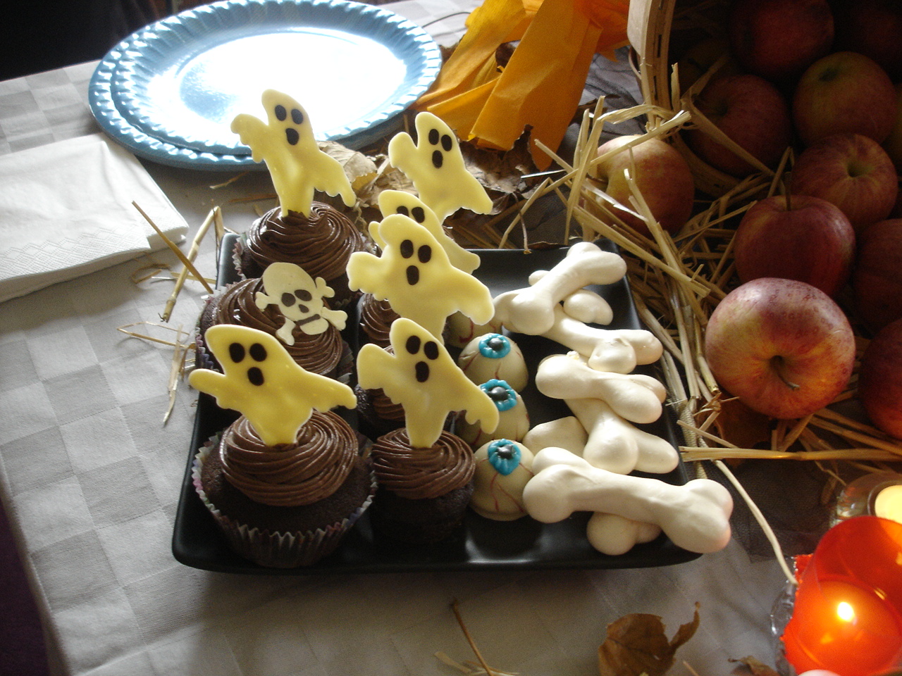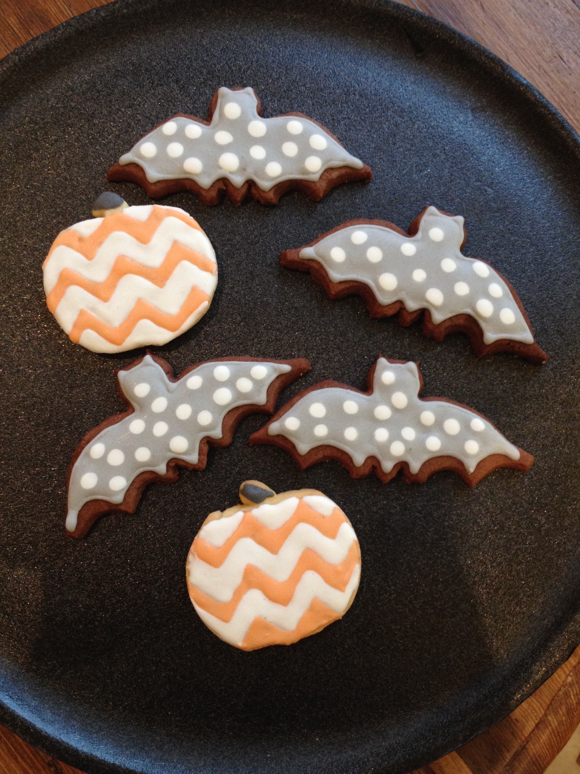 The skull Cookies are glazed in Valrhona chocolate not royal icing as the others are. All of the decoratons for the pumpkin mini cupcakes and featherlight cakes are made from chocolate.