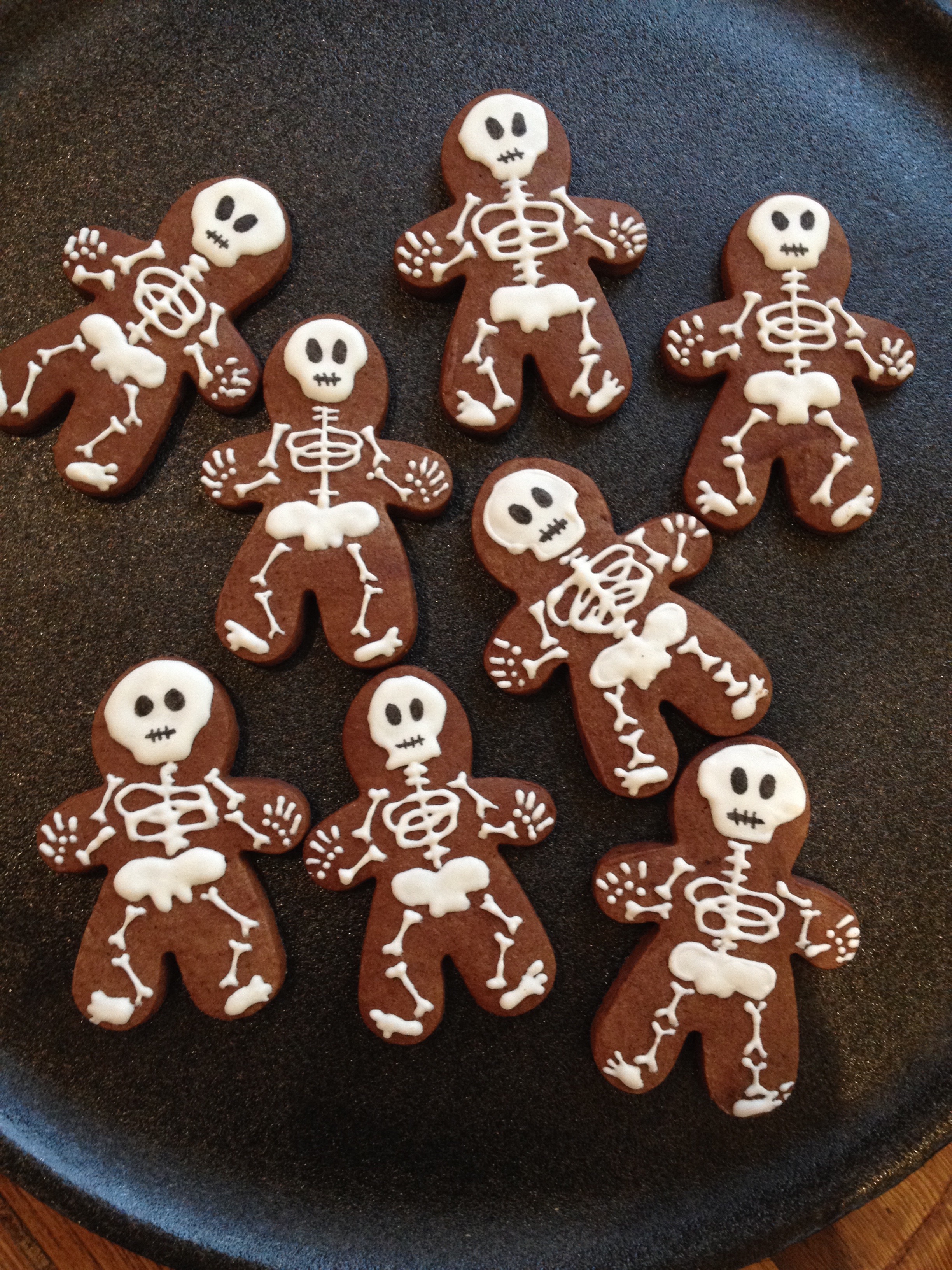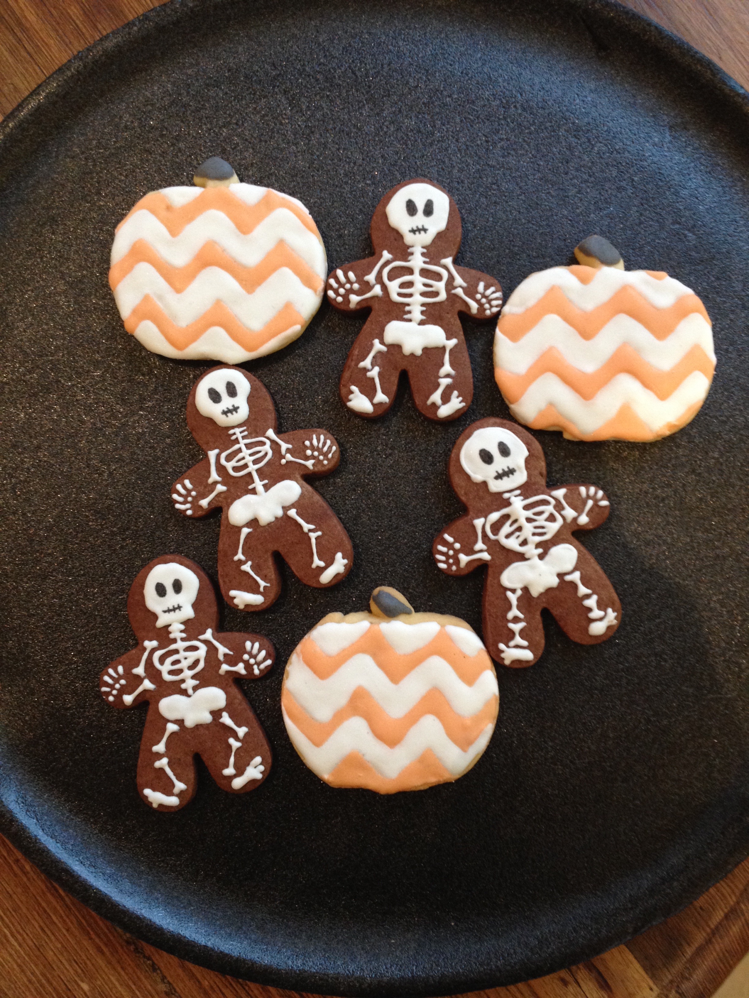 The witches heads were cut out of thinly rolled out black Fondant that i applied onto the royal icing orange base while it was still wet.For the cute Little Skeletons i used gingerbread man cutter on chocolate sugar Cookie dough.K